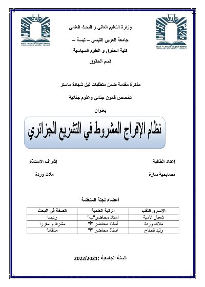 الملخص: من بين الأهداف المستجدة التي تسعى لها المنظومة العقابية الجديدة في الجزائر عملية إعادة إدماج المحبوسين في المجتمع و إصلاحهم و ذلك من خلال إقرار جملة من الأساليب لتكييف العقوبة السالبة للحرية و منها أسلوب الإفراج المشروط و الذي يعتبر بديل من بدائل العقوبة السالبة للحرية الذي تم النص عليه في الباب السادس في الفصل الثالث ضمن القانون 05-04 المتضمن تنظيم السجون و إعادة الإدماج الاجتماعي للمساجين ،و لقد أولى المشرع الجزائري أهمية بالغة لهذا الإجراء حيث نص في مجموعة من النصوص على شروط هذا النظام و إجراءاته الجوهرية التي تضفي عليه طابع المشروعية من اجل تحقيق الغرض السامي للعقوبة و هو تأهيل و إصلاح المحبوس .